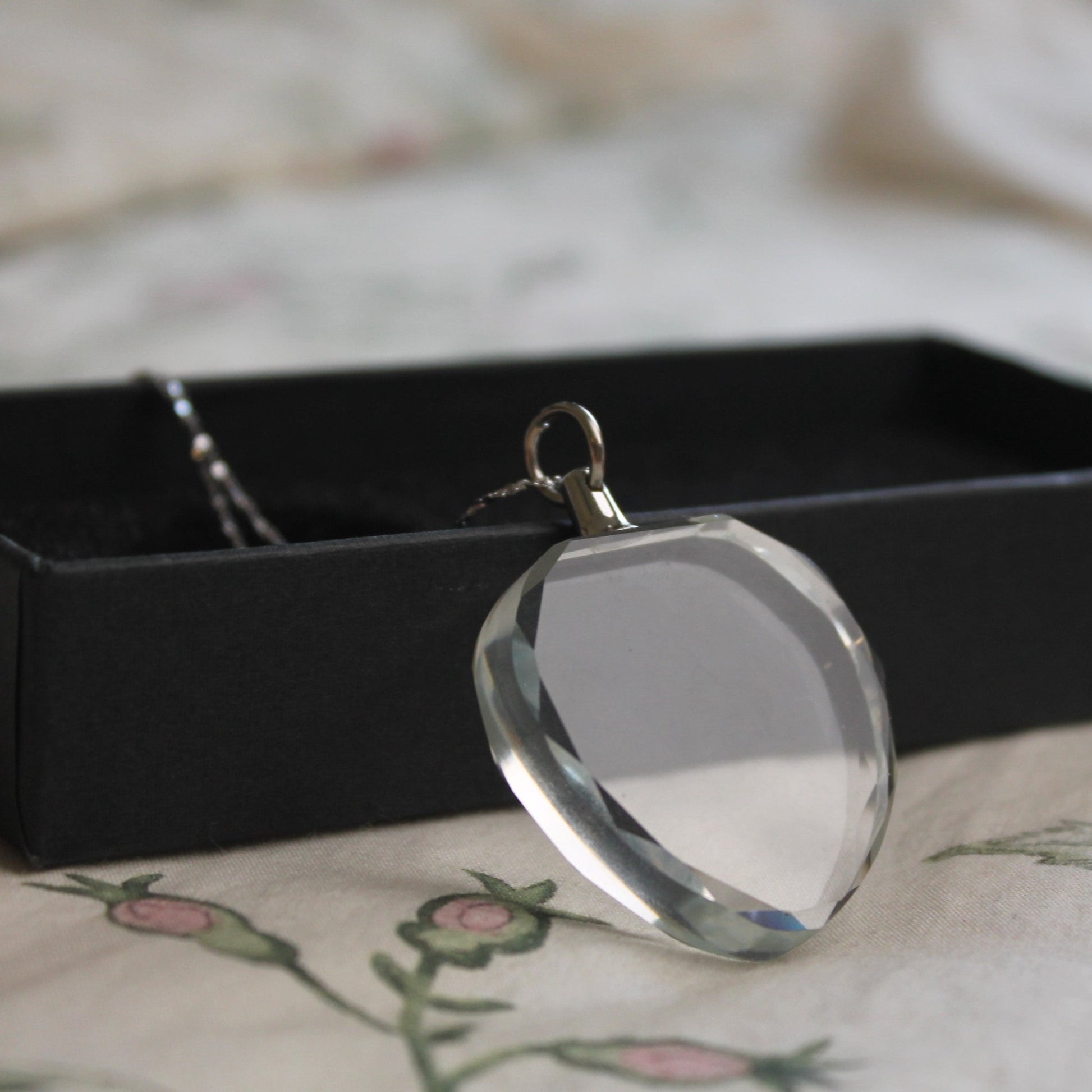 Introducing our exquisite crystal heart necklace - the perfect way to keep your loved ones close to your heart. This stunning piece of jewelry is crafted from high-quality crystal and features a heart-shaped pendant that can be customized with a cherished photo of your choice. With its sparkling, crystal-clear finish and delicate chain, this necklace is sure to catch the eye and draw compliments from all who see it. Order yours today, and discover the joy of wearing a piece of jewelry that holds your most precious memories close.
